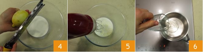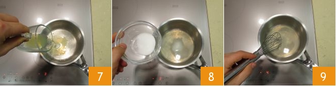and the limoncello 7, add about half of the sugar 8 and then turn on the burner at a low temperature. Stir continuously until the sugar is completely dissolved 9.