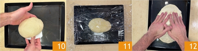 After the resting time, oil a baking tray and place the dough ball on it 10, then also oil the surface of the dough. Cover with plastic wrap 11 and let it rise for 50 minutes at room temperature. After this time, spread the dough inside the tray with your hands 12.