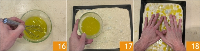 Emulsify with a whisk. After the 2 hours of rising, spread most of the brine over the focaccia 17, being careful to keep some aside to spread after baking. Press the dough with your fingertips to form the characteristic holes 18.