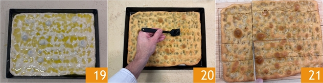 Let it rise for another 15 minutes at room temperature 19. Bake in a preheated static oven at 464°F (340°C) for 18-20 minutes. Once baked, remove it from the oven and brush the surface with the reserved brine 20. Finally, cut the Genoese focaccia into strips and set it aside 21.