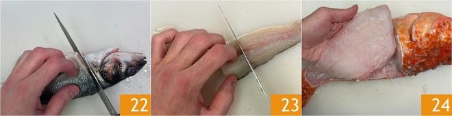 To prepare the bouillabaisse, start by cleaning the fish, being careful to keep all the scraps. How to clean the seabass: remove the head 22, cut along the back, and gut it, then fillet it 23, remove the bones, and cut the fillets into small pieces 23. How to clean the scorpionfish: remove the fins and head, fillet it 34, and remove the belly.