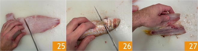 Also, divide the scorpionfish fillets into smaller pieces 25. Handle the red mullets: remove the head 26, cut along the back and open them to obtain the fillets 27, then remove the belly. Again, cut into pieces.