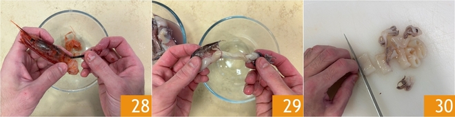 How to clean shrimp: remove the shell, leaving the head and tail, then extract the intestine and set them aside 28. Finally, clean the small squids, removing the internal cartilage and innards 29, then cut them into strips 30.