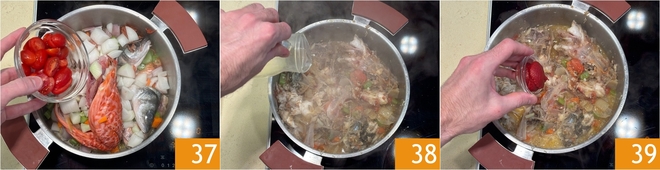 Cover with a lid and cook over low heat for 40 minutes 43. At the end of cooking 44, strain the stock 45 and keep it.