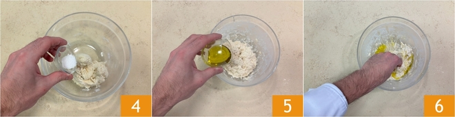 Continue mixing, slowly adding the remaining water. Now add the salt 4 and half of the oil 5, then start kneading by hand 6.