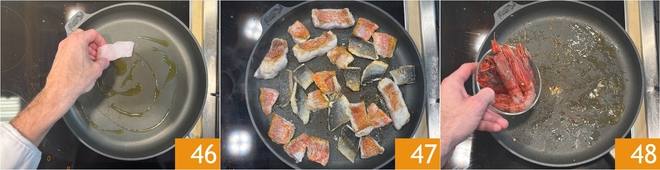 Proceed with cooking the fish: in a pan, pour a drizzle of oil, place the scorpionfish, red mullet, and sea bass pieces 46, and brown on both sides until golden 47. Remove them from the pan and add the red shrimp 48.