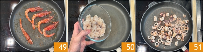 Sauté these too until golden 49 and set them aside. Still in the same pan, sear the squid 50 until golden 51, then set them aside.