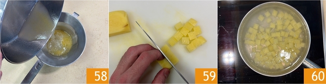 Strain the cooking liquid from mussels and clams and keep it. Now peel the potatoes and cut them into 1/2-inch (1 cm) cubes 59. Blanch them for a few minutes and set them aside 60.