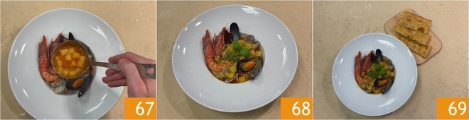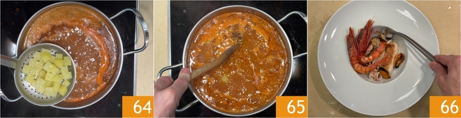 Finally, add the potatoes 64 and continue cooking for 2-3 minutes. Everything is ready to assemble the dishes: place all the fish and shellfish on the bottom 66.