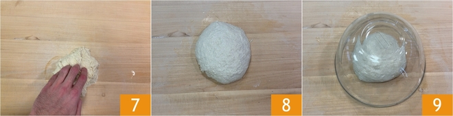 Once the oil is absorbed, transfer the dough onto the work surface 7, fold the dough by stretching it and folding it back on itself, gradually adding the remaining oil. When you have a smooth and homogeneous dough ball 8, cover it with the bowl and let it rest for 15 minutes at room temperature 9.