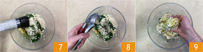 Salt 7, pepper, and season with a crushed garlic clove 8. Knead the mixture with your hands 9.