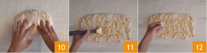 Turn the dough out onto a lightly floured work surface; flatten the dough with your hands 10 and shape into a rectangle about 0.8 inches thick. Brush with 20 g of extra virgin olive oil 11, salt, and sprinkle with durum wheat semolina flour 12.