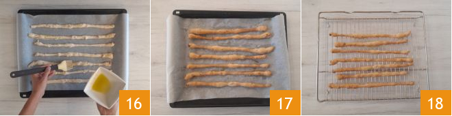 Arrange the breadsticks on a baking tray lined with parchment paper, spacing them slightly apart. Mix 20 g of extra virgin olive oil with 5 g of fine salt. Brush the breadsticks with this mixture 16. Let the dough rise for 1 hour. Bake in a preheated static oven at 374°F for about 20 minutes. Remove the sourdough breadsticks from the oven 17 and let them cool completely on a rack before serving 18.