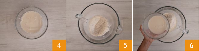 Stir to dissolve it 4. Pour the flour into the mixing bowl 5 and add the dissolved sourdough 6. Attach the dough hook and set to medium speed. Gradually add the remaining water in a thin stream, little by little, continuing to knead.