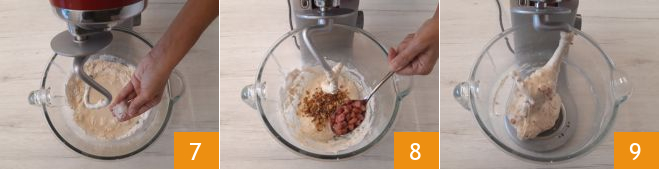 Knead for 10 minutes, then stop the mixer and add the fine salt 7, dried onion, and crispy bacon 8. Continue kneading until the dough is well combined 9.