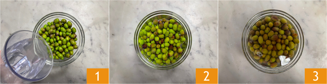 To prepare the brined olives, first select only the intact ones. Discard any olives that show even a slight bruise, as these could compromise the final result. Wash the olives under running water, and once they are thoroughly cleaned, place them in a large bowl and cover them completely with water 1. Place a weight on the olives to keep them submerged. Change the water daily for 20 days 2. After these days 3, you can proceed to prepare the brined olives.