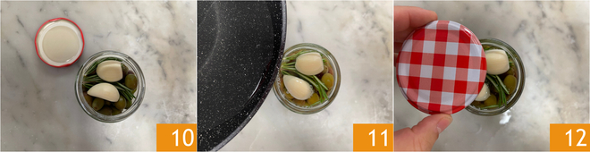 Season with garlic and rosemary 10 and, once the brine is cold, pour it over the olives 11. Close each jar with a lid 12 and store in a cool, dry place away from light. Let your brined olives marinate for at least a month before consuming.
