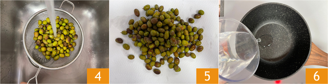 Drain the olives from the water, rinse them 4, and place them on a clean cotton cloth to dry 5. Prepare the brine by pouring water into a small pan 6.