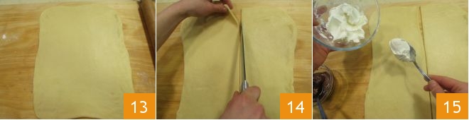 until you get a 12x16 inch rectangle of dough 13. Then, with a knife, divide it in half lengthwise 14. Add the cream cheese to one of the two halves 15