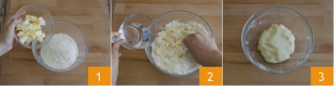 To prepare the candies with pistachios, bresaola, and robiola, first prepare the brisè dough. In a bowl, or in the bowl of a stand mixer, place the flour. Add the cubed butter 1 and gradually add the water 2. Both the butter and the water must be very cold. Quickly work the brisè dough until you obtain a homogeneous mixture 3.