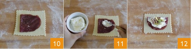 and place a slice of bresaola on top 10. Spread the robiola 11 and add the shelled pistachios 12.