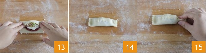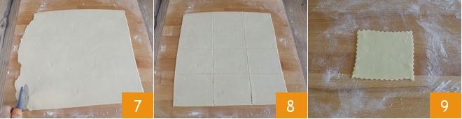 Use a pastry wheel to trim the edges of the sheet 7 giving it an almost rectangular shape. Cut it into rectangles measuring 4x5 inches. With these doses, you will get 12 candies 8. Now take each rectangle 9