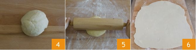 Form a dough ball 4 and let it rest in the refrigerator for 30 minutes. After the resting time, take the dough ball, sprinkle the work surface with a little flour, and roll out the brisè dough with a rolling pin 5 to obtain a thin sheet 6.