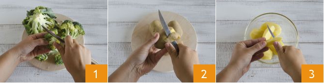 To prepare the broccoli and salmon meatballs, bring a large pot of water to a boil and season with salt to taste. Remove the florets 1, wash them. Then wash the potatoes as well, peel them 2 and cut them into chunks 3.