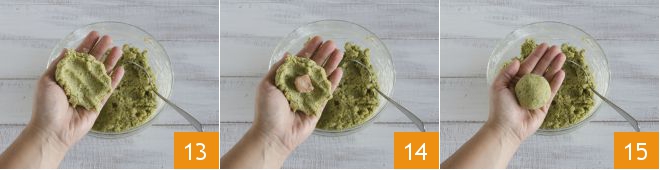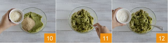Add the breadcrumbs and Parmesan 10, season with black pepper. Mix with a spoon, finally add the flour 12 and continue to mix. The mixture should not be too soft.