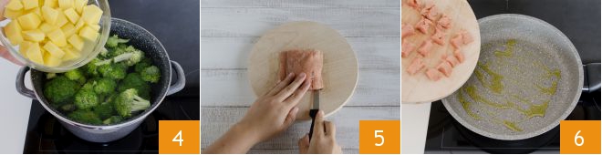 Boil both the broccoli and potatoes together 4. Once ready, drain them and let them cool slightly. Meanwhile, clean the salmon by removing the skin with a sharp knife 5. Cut it into cubes, trying to make them all the same size. Heat some oil in a pan and add the salmon cubes 6.