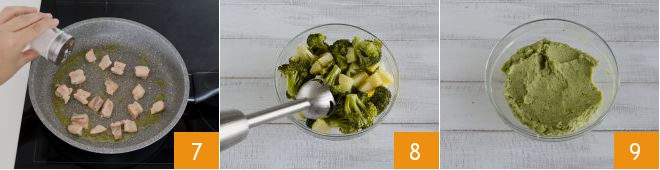 Salt 7 and sauté for about ten minutes, turning halfway through cooking. When it is cooked, let it cool slightly. Blend the broccoli and potatoes with an immersion blender 8 until they turn into a cream 9.