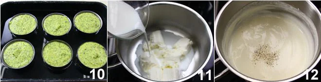 Butter the molds and fill them with the obtained mixture; place a pan that can hold the molds on the stove and fill it with water up to one-third of its height: when the water boils, turn off the heat, immerse the molds in the bain-marie 10, and bake in a preheated oven at 356°F for about 40 minutes. Ten minutes before the end of cooking, prepare the goat cheese sauce: put the cheese in pieces in a saucepan over very low heat and add a little milk 11, just enough to dissolve the goat cheese and form a more or less dense cream, depending on taste. Salt, add freshly ground white pepper 12, and stir until you get a smooth cream without lumps.