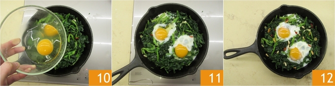 As soon as the broccoli rabe are cooked, spread them slightly to create two cavities where you will pour the eggs 10. Let them cook for a few minutes until the egg white is well cooked, while the yolk must remain soft 11. Pour the pine nuts and season with salt and pepper if you like. Your eggs are ready, serve them hot 12.