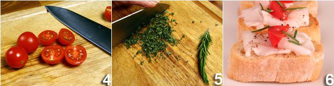 Wash and quarter the cherry tomatoes 4 and chop the rosemary; arrange the lard on the bread, then sprinkle it with ground pepper; place a quarter of a tomato and the chopped rosemary on each bruschetta 6. Serve immediately.