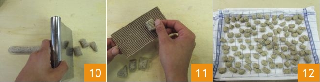 Cut these logs into 1 cm (about 0.39 inch) pieces using a bench scraper or knife 10. Roll each piece on a gnocchi board 11 to create the typical ridges. If you don't have a gnocchi board, you can use the tines of a fork to achieve the same pattern. As you prepare the gnocchi, place them on a tray covered with a tea towel 12. Once you've finished the gnocchi, set a pot of salted water on the stove to boil.