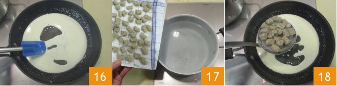 When you have obtained a velvety consistency 16, cook the gnocchi for a few minutes in boiling water 17, and as they rise to the surface, use a slotted spoon to transfer them directly into the pan with the sauce 18.