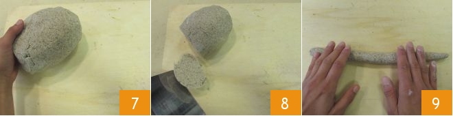 Form a loaf 7. Use a bench scraper to cut portions of dough 8 and shape each into a log 9.