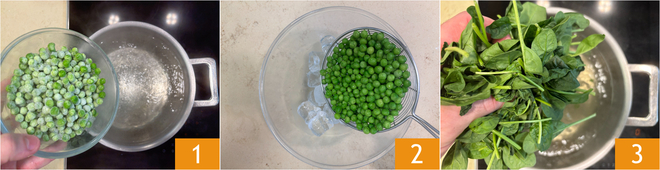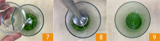 Drain and also plunge the spinach into ice water 4. Drain the vegetables and transfer them to a jug, being careful to set aside about 1.8 oz of peas for plating. Season with oil 5, salt, and pepper 6.
