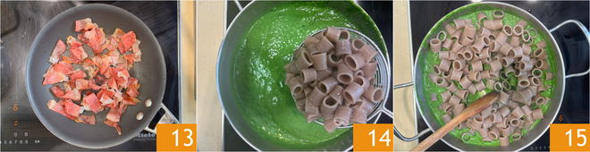 Cook the buckwheat pasta in the same water in which you blanched the vegetables 10. Meanwhile, roughly chop the speck 11 and toast it briefly in a pan 12.