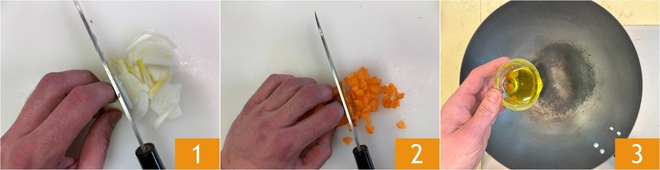Add to the wok the peeled and finely chopped garlic 4, sliced onion 5, and chopped carrots 6.