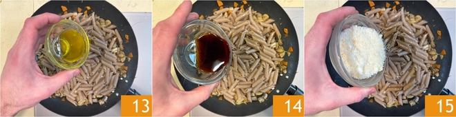 To finish, pour in the other half of the oil 13, the gluten-free soy sauce 14, and the grated Parmesan cheese 15.