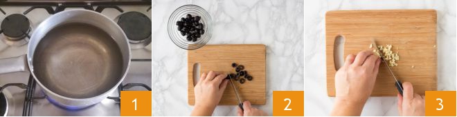 To prepare the buckwheat penne with yogurt and olives, first put a pot full of salted water on the stove and bring it to a boil 1, it will be used for cooking the pasta. Then, take care of the seasoning: cut the olives into thin slices 2, peel the garlic and chop it with a knife 3.