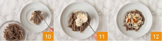 Add the drained pasta as well 10 and cover with more sauce 11. The buckwheat penne is ready to be served 12.