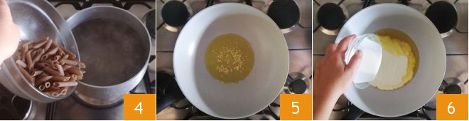 Meanwhile, cook the pasta for the time indicated on the package 4. Pour the oil and chopped garlic into a pan and sauté for a few minutes over low heat to add flavor 5, then add the yogurt 6