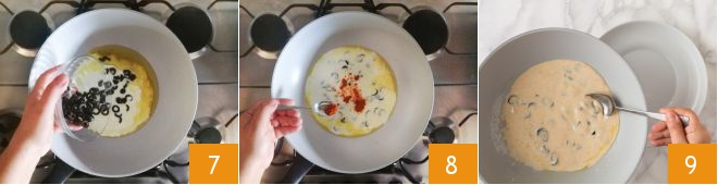and the olives 7, also add the paprika 8 and cook for about a minute stirring with a wooden spoon, then remove the sauce from the heat. Pour a few tablespoons of sauce onto the serving dish 9