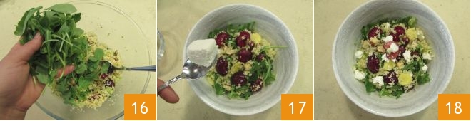 then add the arugula that you have previously washed and dried 16, mix well, and finally add chunks of goat cheese on top 17: your bulgur with cherries and goat cheese is ready to be enjoyed 18!