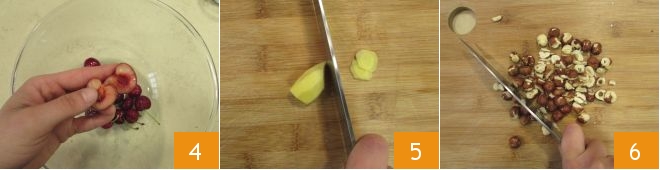 In the meantime, wash the cherries, cut them in half, and remove the pits 4. Peel the ginger and cut it into thin slices 5. Coarsely chop the hazelnuts with a knife 6.