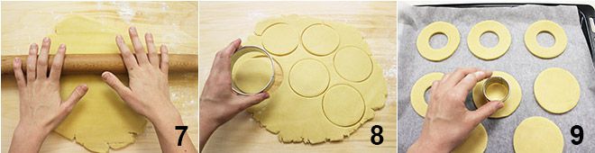 After the indicated time, lightly dust a work surface with flour, take the shortbread dough, and roll it out with a rolling pin: you should aim for a sheet about 1/5 inch thick 7. Use a round cutter 4 inches in diameter to cut out 22 circles 8 and place them on a baking sheet lined with parchment paper. With the leftover dough, roll out another sheet and cut out another 22 discs of the same diameter, which you will core in the center using a smaller cutter (1 3/4 inches in diameter) 9. Place these cookies on the baking sheet as well and bake everything in a preheated oven at 350°F for 15 minutes. Once the surface is golden, take them out of the oven and let them cool on a wire rack.
