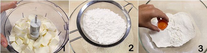 To make the bull's eye cookies, start by preparing the shortbread dough: remove the butter from the fridge and let it sit at room temperature for about 20 minutes, then proceed by placing the flour and the chopped butter into a mixer 1. Blend everything very well until you get a sandy and floury consistency; then transfer it to a large bowl and add the sifted powdered sugar 2, the seeds from the vanilla bean, eight egg yolks, and a pinch of salt 3.