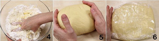 Begin mixing all the ingredients with your hands in the bowl 4, then continue working the dough on a work surface: you should achieve a compact and elastic dough 5. As soon as the shortbread dough is ready, form a ball, cover it tightly with plastic wrap 6, and place it in the refrigerator to rest for about half an hour.